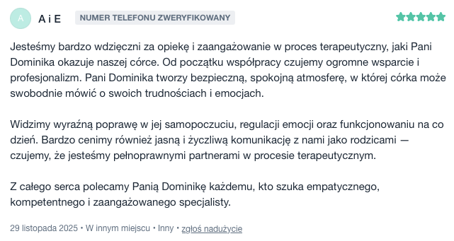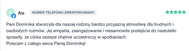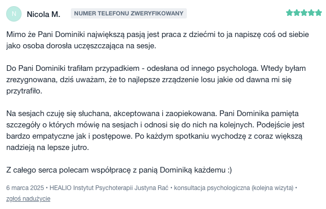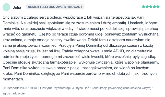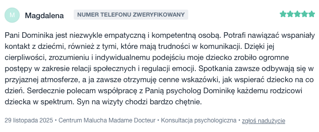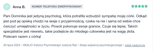 Wspieram w nim rodziców, którzy są przeciążeni konfliktami, histeriami i ciągłym ‘nie’, żeby w kilka tygodni odzyskali więcej spokoju, skuteczniejsze granice i większą współpracę dziecka. Daję jasny proces (psychoedukacja, monitoring, regulacja emocji, komunikacja, praca z przekonaniami) — bez obietnicy cudownej przemiany, w oparciu o praktyczne narzędzia do codziennych sytuacji.
